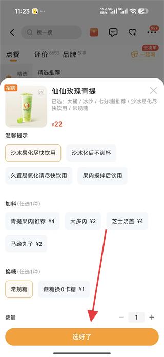 2、在規格選擇頁面可查看奶茶的溫馨提示、選擇加料和換糖,確定后點擊選好了,將奶茶添加到購物車。