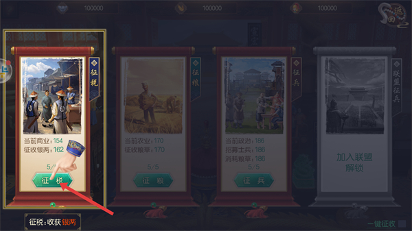 4、可進行征稅操作,點擊征稅按鈕,收取銀兩,增加國庫收入,為國家發展提供資金支持。