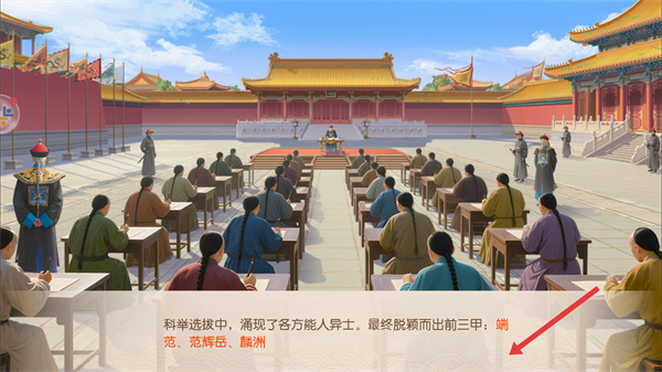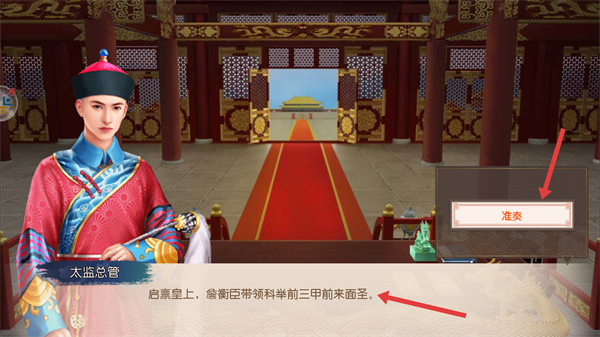 2、太監總管會稟報科舉前三甲前來面圣,點擊準奏按鈕,召見新科進士,推進朝政進程。