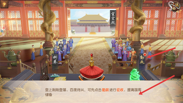 3、皇上剛登基可點擊勤政進行征收,提升國庫儲備,開展征稅、征糧、征兵等操作,壯大國家實力。