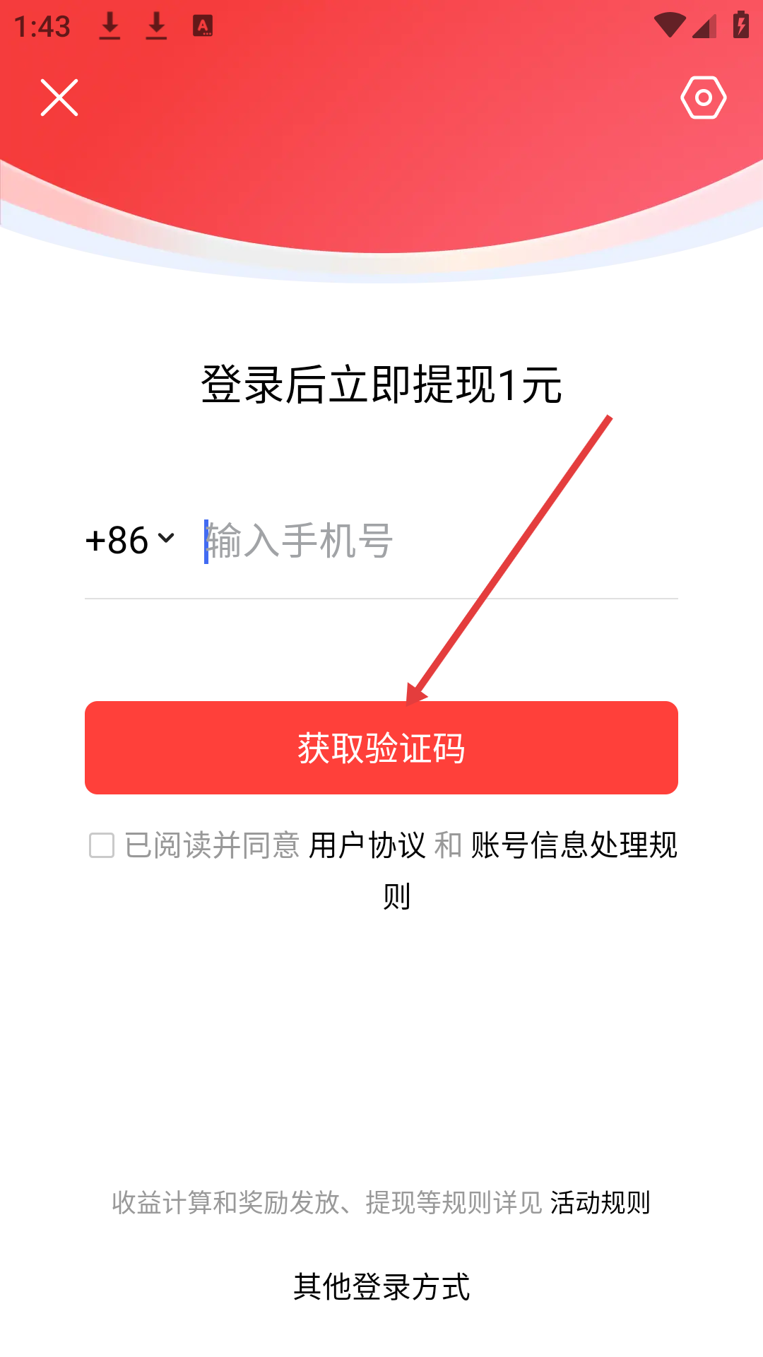 3、在登錄界面輸入手機號碼,勾選已閱讀并同意相關協議和規則后,點擊獲取驗證碼后續填入收到的驗證碼即可完成登錄,也可選擇其他登錄方式便捷操作。