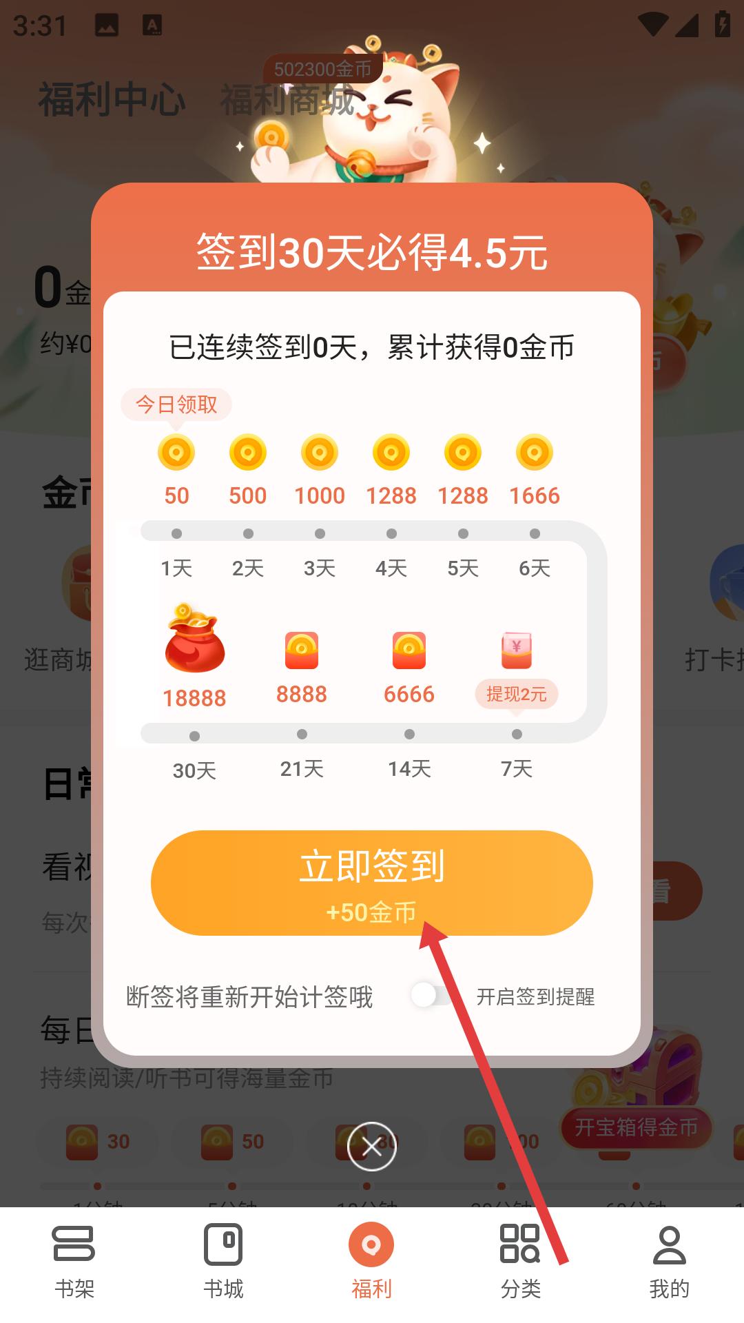 1、進入福利頁面,看到簽到彈窗,點擊立即簽到按鈕,完成簽到獲取金幣。