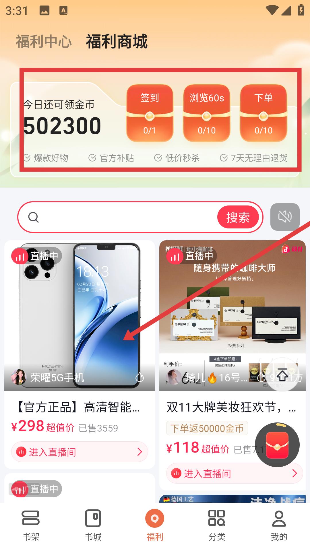 4、進入福利商城頁面后,可查看今日可領金幣數量,以及簽到、瀏覽等任務,還能瀏覽商城內的商品,如手機、美妝等。