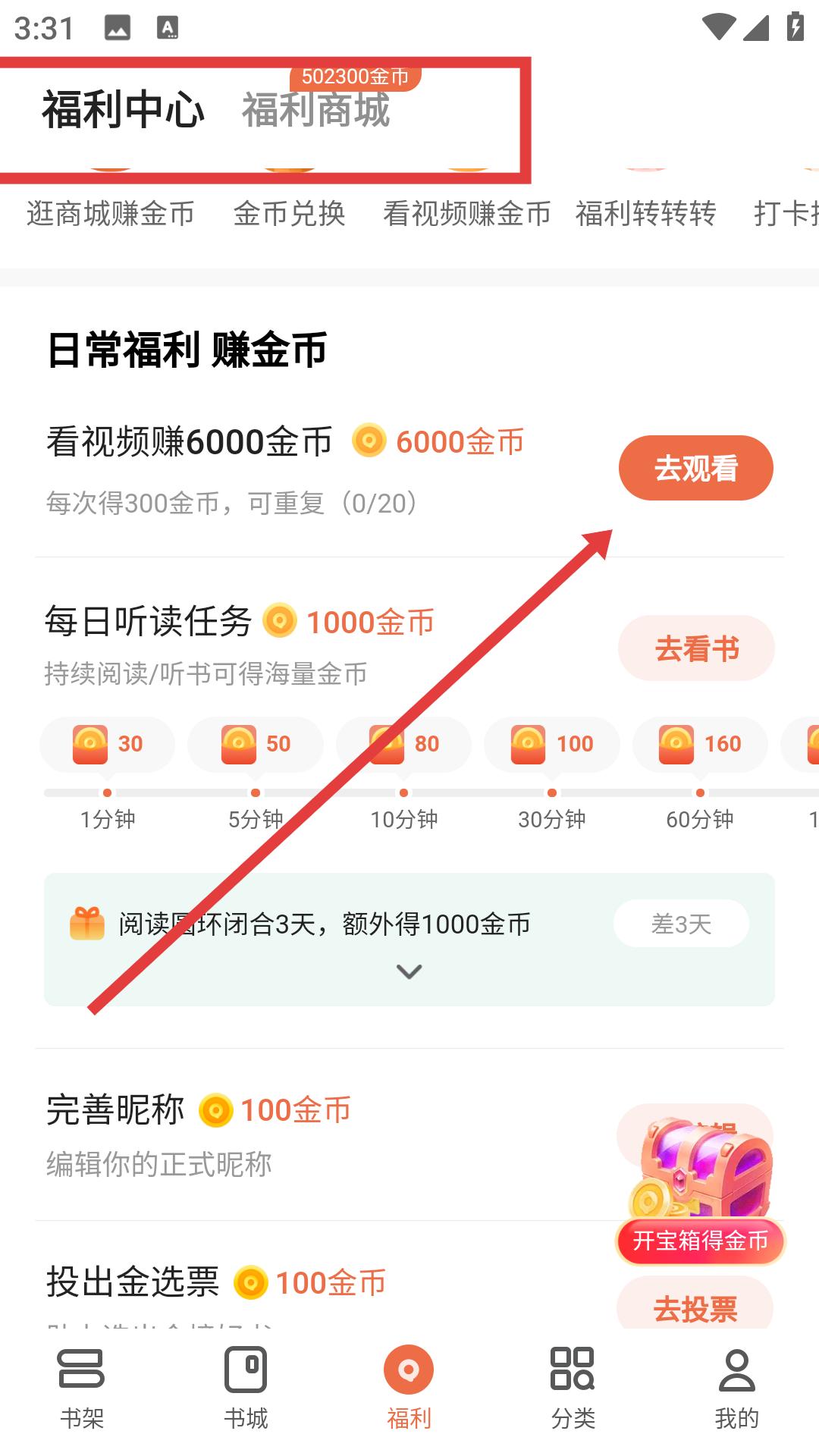 3、關閉簽到彈窗后在福利中心頁面,找到福利商城入口,點擊進入福利商城頁面。