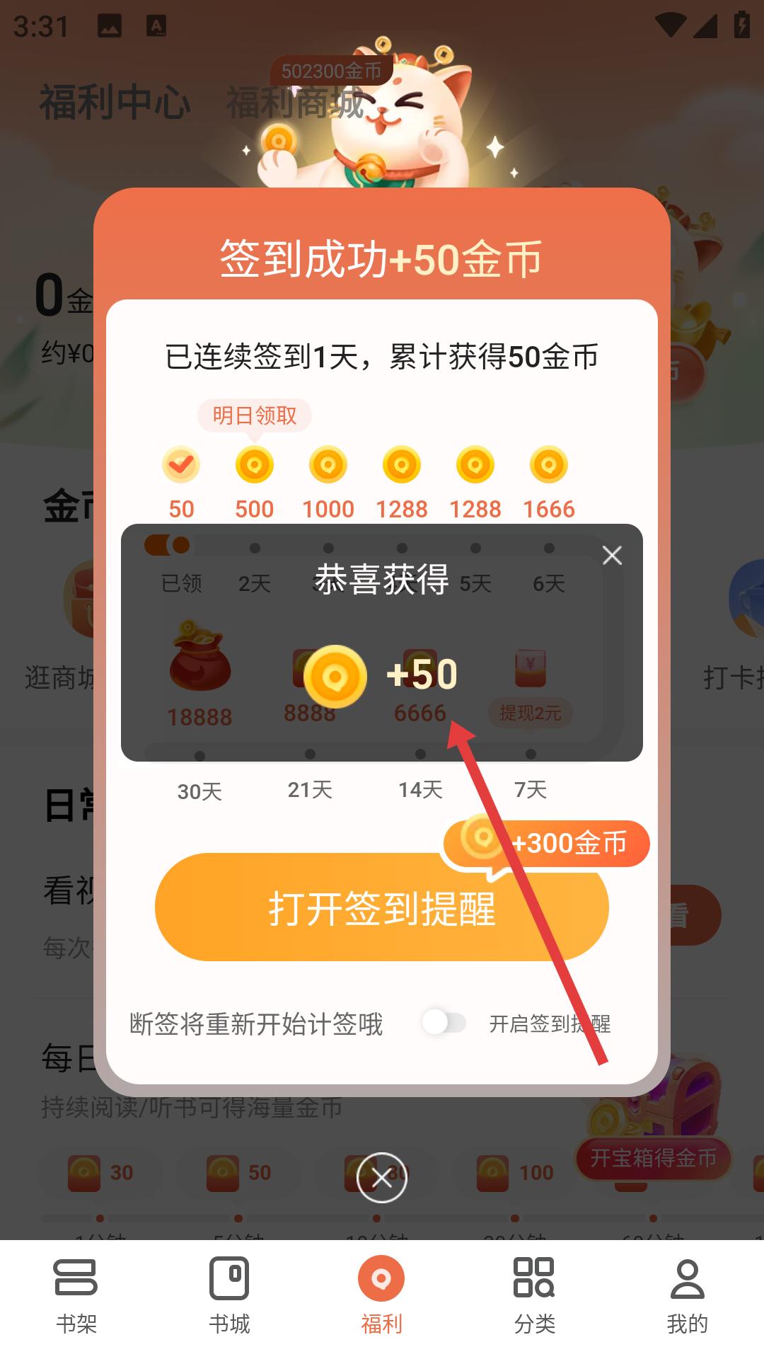 2、簽到成功后會顯示簽到成功及獲得金幣的提示,可根據需求選擇是否打開簽到提醒。