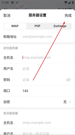 4、在服務器設置頁面選擇IMAP、POP或Exchange協議,填寫郵箱地址、收信服務器、用戶名、密碼等信息,點擊完成,完成郵箱的手動添加配置。