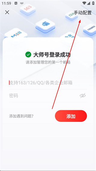 3、登錄成功后點擊手動配置,進入郵箱添加的手動配置流程,可添加163、QQ、各類企業郵箱等。