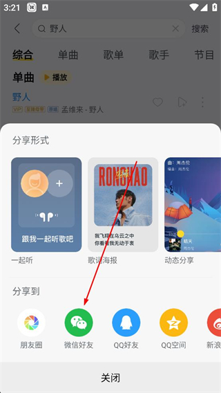 4、點擊分享按鈕進入分享選項頁面,可選擇朋友圈、微信好友等分享方式,將歌曲分享給他人。