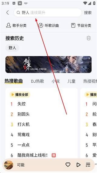 1、打開酷我音樂APP進入搜索頁面,在搜索框輸入關鍵詞,如野人進行音樂搜索。
