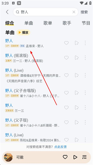 2、在搜索結果頁面選擇感興趣的單曲,如孟維來的野人,點擊進入音樂播放頁面。