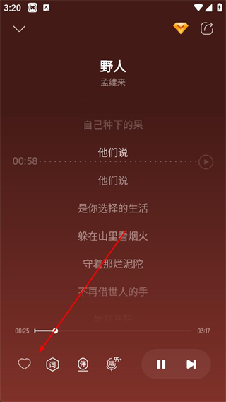 3、在音樂播放頁面可查看歌曲歌詞,點擊收藏按鈕,將歌曲加入收藏夾,方便后續收聽。