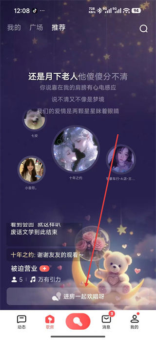 1、打開全民K歌軟件廣場頁面,查看推薦的歌房內容,點擊進房一起歡唱呀按鈕,進入對應的歌房界面,準備參與互動。