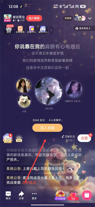 2、在歌房界面查看當前合唱人數,點擊加入合唱按鈕,參與歌曲演唱,同時可查看系統公告了解歌房活動信息。