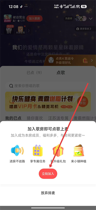 4、在歌房提示彈窗中點擊立即加入按鈕,成為本房成員,解鎖點歌上榜等權益,享受更多歌房專屬福利。