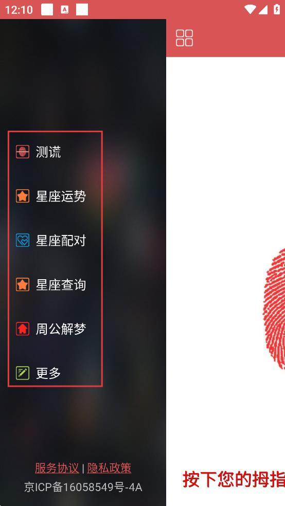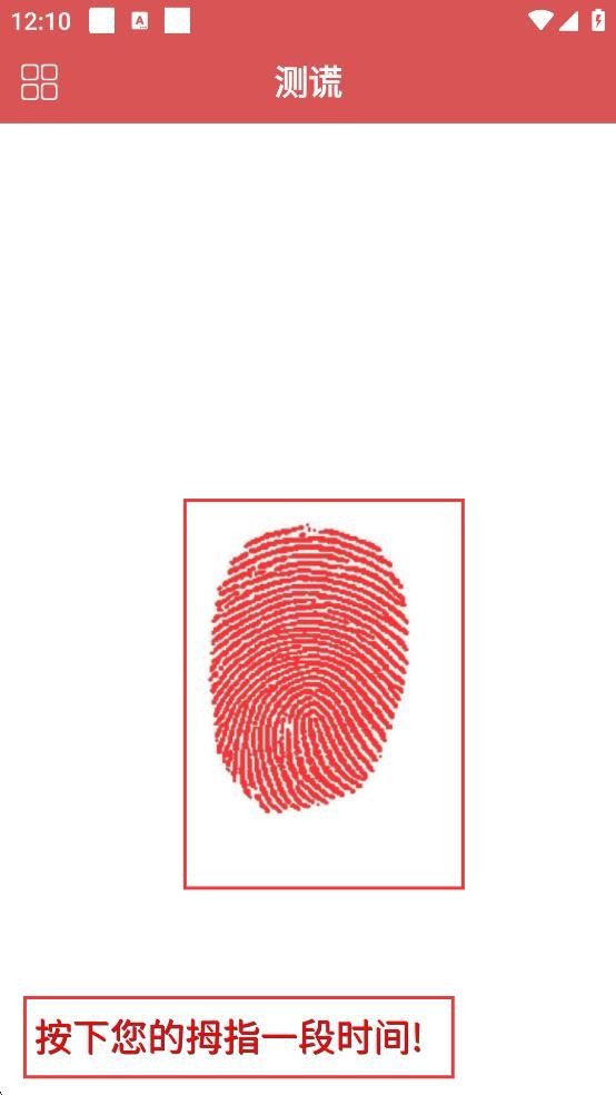 1、下載安裝完成之后進入app,可以看到首頁就是一個測謊界面,根據下方的提示,將拇指長按在屏幕上,即可開始測謊。