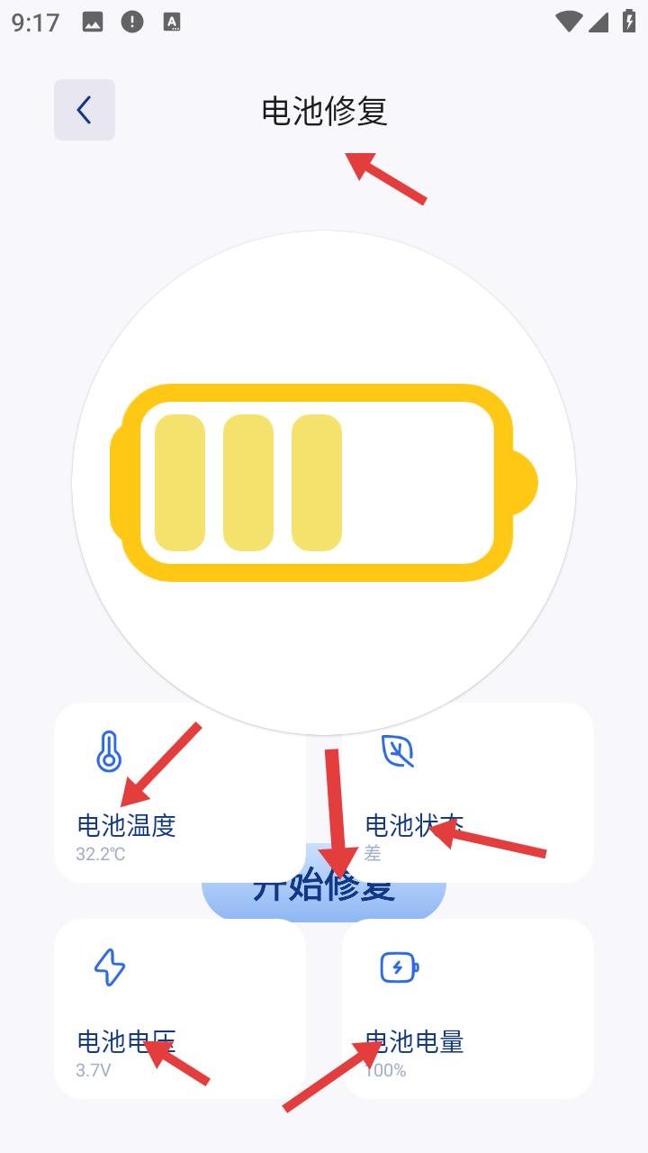 3、電池修復頁面,電池圖標下方,電池溫度、狀態差、電壓、電量清晰呈現,點擊開始修復按鈕,可嘗試優化電池性能,改善續航表現。