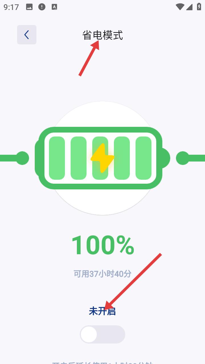 2、省電模式界面,綠色電池圖標顯示電量,下方標注可用37小時40分,未開啟狀態通過滑塊呈現,開啟后可優化功耗,延長手機續航,助力設備節能運行。