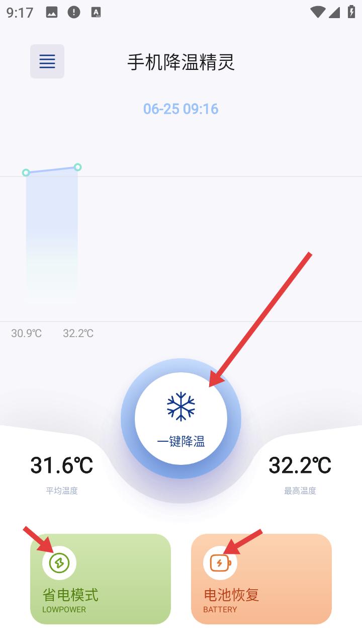 1、手機降溫精靈主界面,折線圖展示溫度變化,中央雪花圖標是一鍵降溫按鈕,兩側顯示平均31度、最高32度,省電與電池恢復功能并列,便捷管理設備溫控。