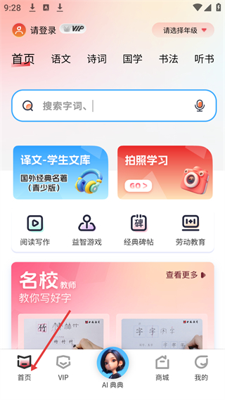 1、首頁板塊可選擇年級,有語文、詩詞等分類,搜索欄可搜字詞,還有譯文學生文庫、拍照學習等功能,以及名校教師教你寫好字等內容推薦。