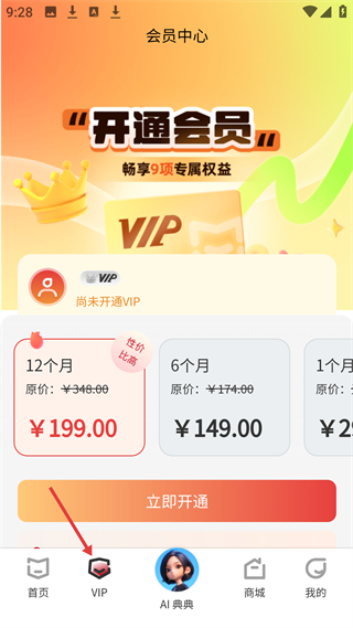 2、會員中心板塊,開通會員能暢享9項專屬權益,有12個月、6個月等時長的會員套餐,不同套餐有優惠價格可立即開通。