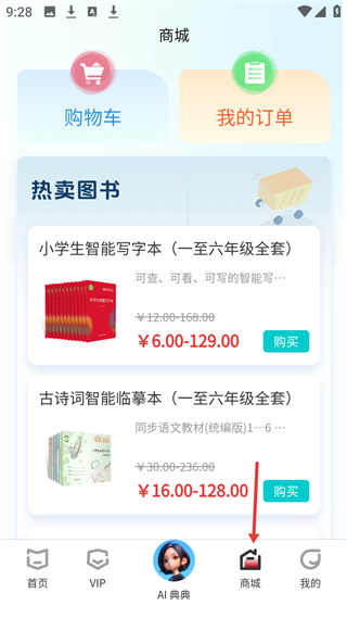 3、商城板塊有購物車、我的訂單入口,熱賣圖書包括小學生智能寫字本、古詩詞智能臨摹本等,不同套裝有相應價格可點擊購買。