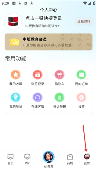 4、個人中心可一鍵快捷登錄,中版教育伴你進步,有會員開通入口,常用功能含收藏、瀏覽記錄、購物車等方便管理。