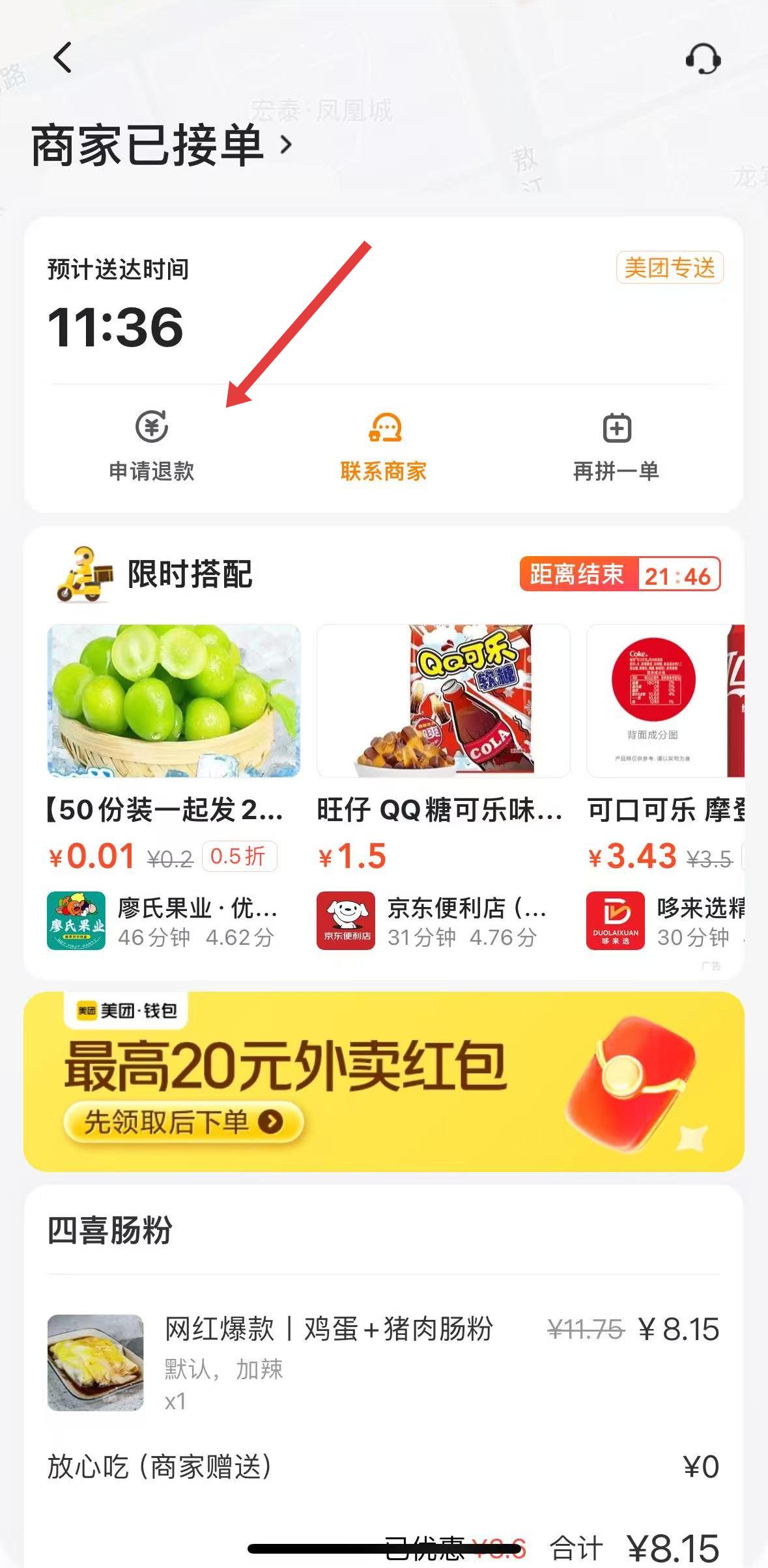 1、商家已接單界面,申請退款按鈕清晰,點擊可進入售后流程,訂單含四喜腸粉及限時搭配商品,方便用戶處理訂單問題。