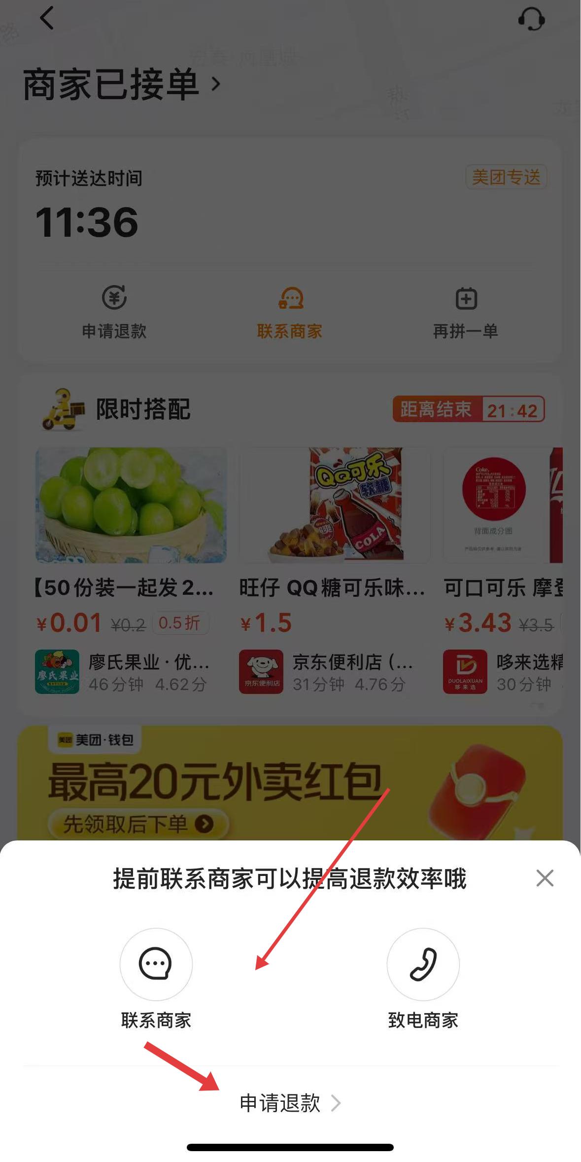 2、商家已接單頁面,可通過聯系商家、致電商家溝通,也能直接點申請退款,發起售后操作。