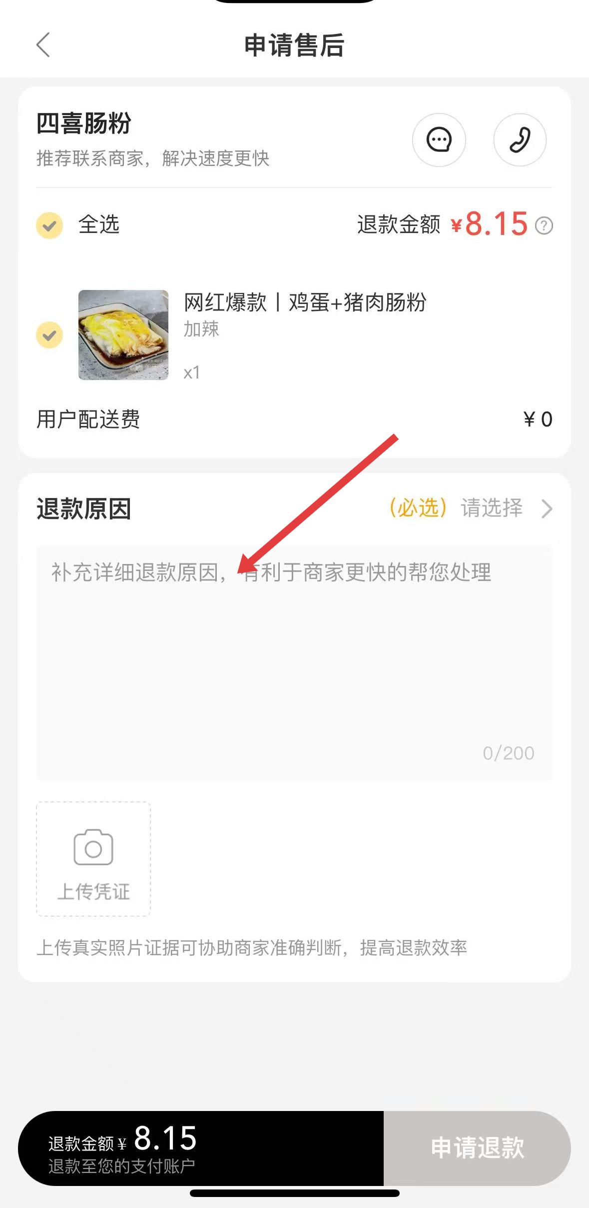 3、申請售后頁面,選定四喜腸粉訂單,需選退款原因并補充詳細說明,填好后點申請退款,推進售后流程。