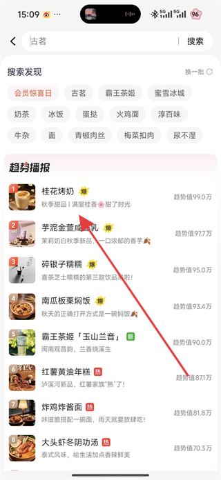 2、在搜索欄輸入飲品相關名稱,比如古茗點擊搜索,可看到搜索發現的會員驚喜日、奶茶等標簽,還有趨勢播報板塊展示各類飲品。
