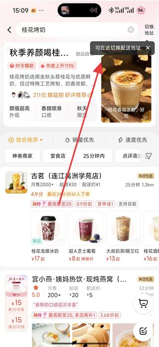 3、選擇趨勢播報里的飲品,比如桂花烤奶,點擊進入相關頁面,可看到飲品介紹,還有綜合排序、銷量優先等排序選項,以及不同店鋪的桂花烤奶展示。