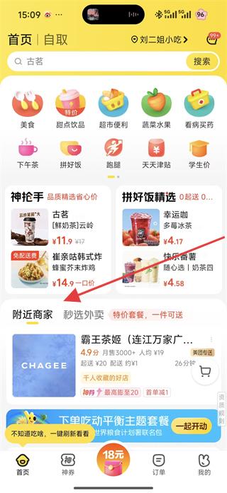1、打開美團APP,進入首頁可看到搜索欄,還有美食、甜點飲品等分類標簽,以及神搶手、拼好飯精選等板塊。