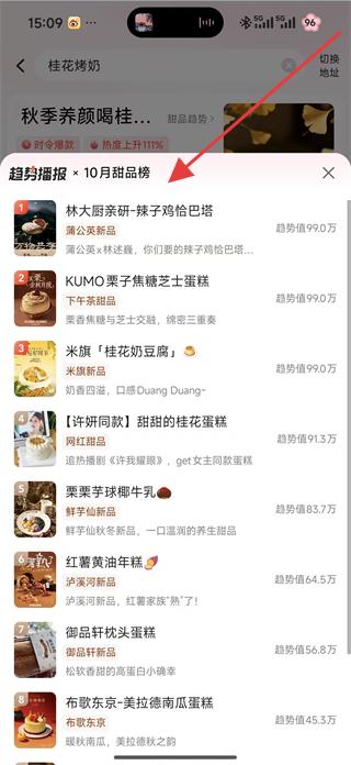 4、在桂花烤奶頁面點擊趨勢播報相關按鈕,可查看10月甜品榜,榜單里有林大廚親研辣子雞恰巴塔、KUMO架子焦糖芝士蛋糕等甜品展示。