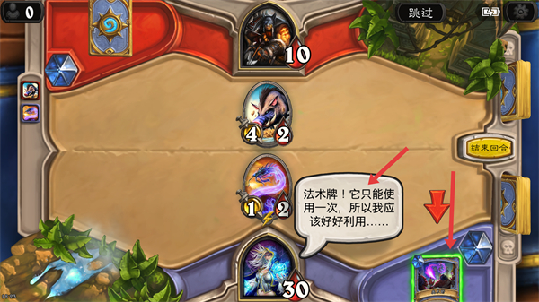 3、對戰過程,要留意法術牌,法術牌只能使用一次,需好好利用,根據戰局情況,選擇合適時機使用。