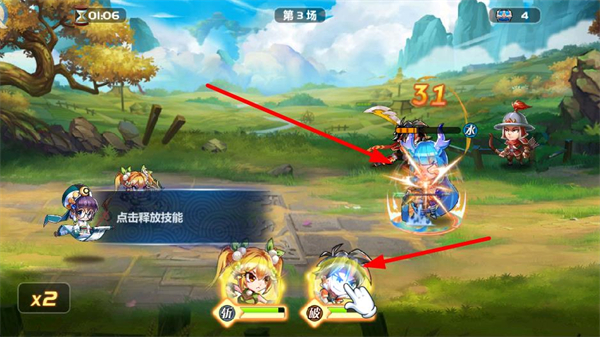 1、點擊釋放技能,操控武將對敵人發起技能攻擊,造成傷害,助力消滅敵人,推進戰斗進程。