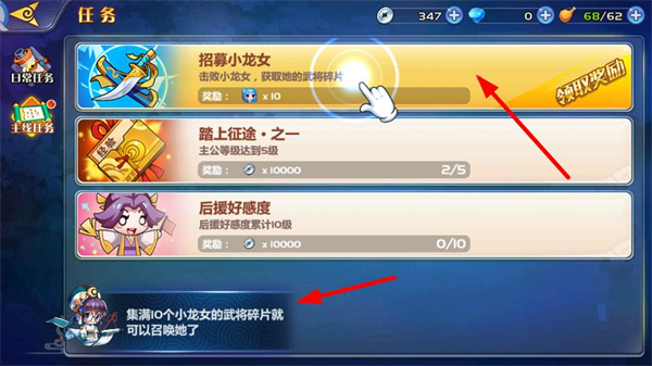 4、在任務界面可接取招募小龍女等任務,集滿小龍女的武將碎片可召喚她,完成任務還能獲得相應獎勵。
