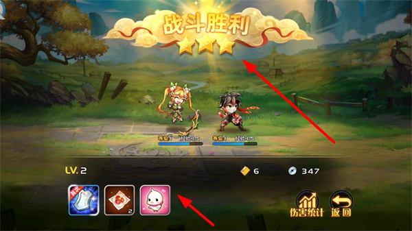 3、戰斗勝利后會獲得三星評價,同時可獲得金幣、道具等獎勵,點擊返回可繼續進行其他游戲操作。