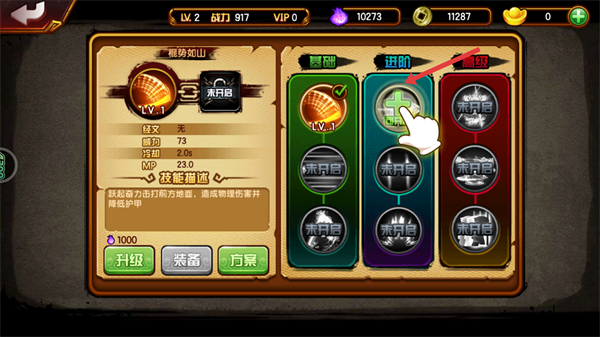 2、進入技能界面,能對技能進行進階操作,提升技能威力,助力戰斗,同時還有基礎、高級技能待開啟。