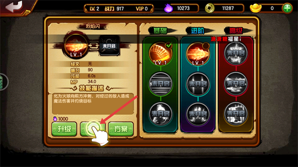 3、在技能界面可點擊裝備按鈕,給角色裝備技能,還能升級技能,增強角色戰斗力,應對不同戰斗場景。