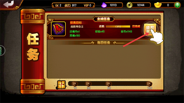 1、可在任務界面查看主線任務,完成戰勝怪物等目標后,點擊領取獎勵,獲取經驗、金幣、靈魄等資源。