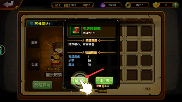 4、在裝備界面可查看裝備屬性,點擊裝備按鈕給角色穿戴裝備,提升戰斗力,也可選擇出售裝備獲取資源。
