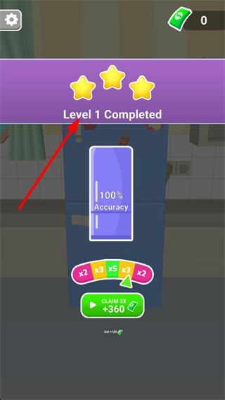 3、當前關卡完成后,界面顯示三星評價與百分百準確率提示,點擊對應按鈕領取獎勵,結束本關流程。
