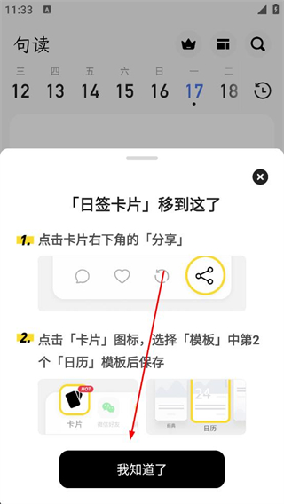 4、最后看到日簽卡片移動的提示,了解分享和保存模板的操作方法,點擊我知道了關閉提示。