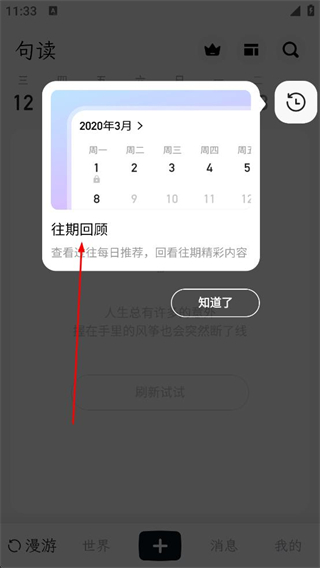 2、接著看到往期回顧的提示,了解可查看往日推薦內容,點擊知道了關閉提示。