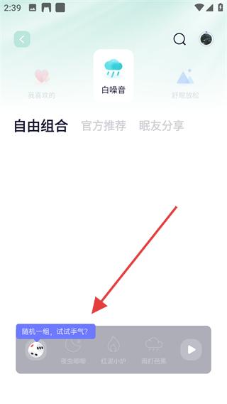 2、在白噪音頁面可選擇自由組合、官方推薦等分類,點擊隨機一組試試手氣可隨機播放白噪音,幫助快速入睡。