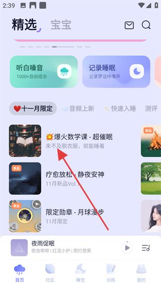 1、進入精選頁面可看到聽白噪音、記錄睡眠等功能入口,還有爆火數學課超值催眠等音頻推薦,點擊聽白噪音進入白噪音頁面。