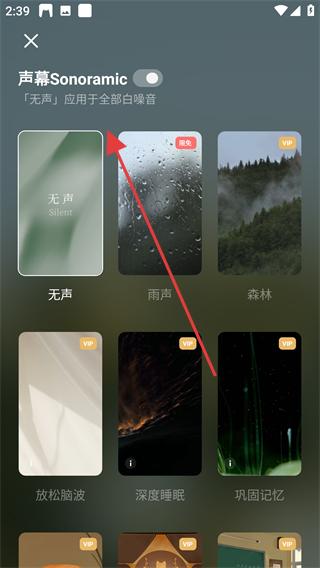 4、在聲幕設置頁面,可選擇無聲、雨聲、森林等不同的白噪音場景,開啟聲幕后可享受更沉浸的白噪音體驗,助力優質睡眠。