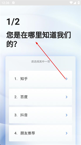 3、進入信息填寫頁面回答是在哪里知道該APP的,選擇知乎、百度等選項,完成第一部分信息填寫。