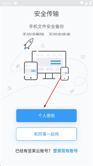 1、進入APP安全傳輸頁面選擇個人使用,也可以選擇和同事一起用,以便進行手機文件的安全備份。