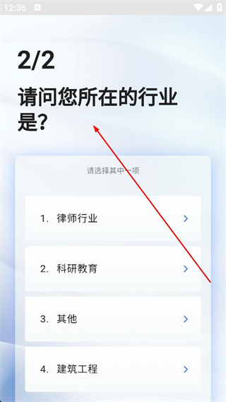 4、繼續回答所在的行業選擇律師行業、科研教育等選項,完成第二部分信息填寫,以便APP為用戶提供更貼合需求的服務。